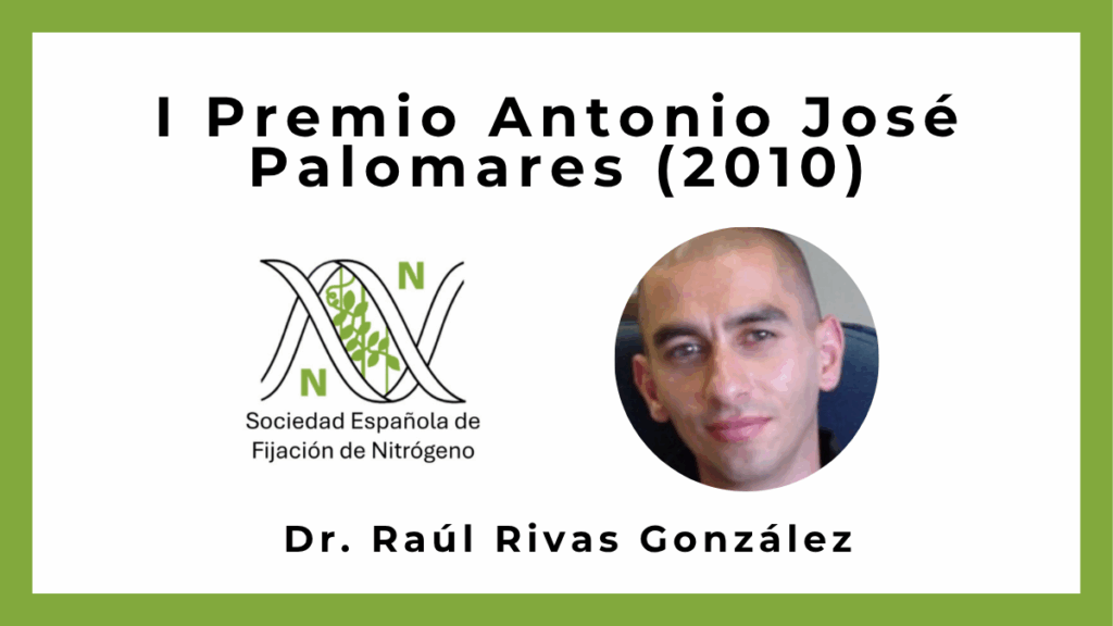 Vistos los méritos presentados por los candidatos que optan al I Premio Antonio J. Palomares 2010, la Junta Directiva de la Sociedad, reunida el 19 de febrero de 2010, ha decidido otorgar dicho Premio al Dr. Raúl Rivas González (Departamento de Microbiología y Genética, Facultad de Ciencias Agrarias y Ambientales, Universidad de Salamanca).